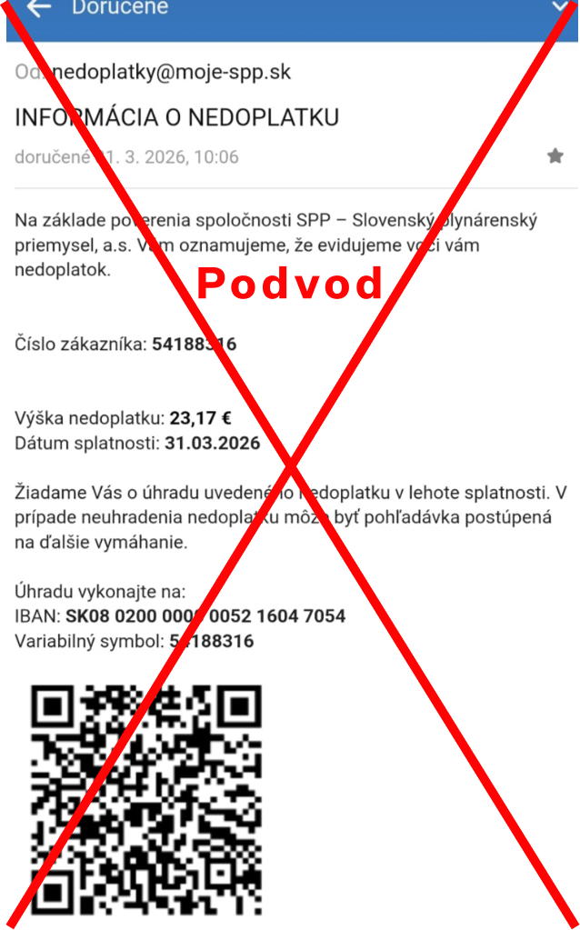 Podvodné správy informujú o údajnom nedoplatku za dodávku energií a vyzývajú na jeho okamžité uhradenie prostredníctvom falošného čísla účtu resp. QR kódu. Tento odkaz však vedie na falošné webové stránky, ktoré môžu zneužiť osobné alebo platobné údaje zákazníkov.